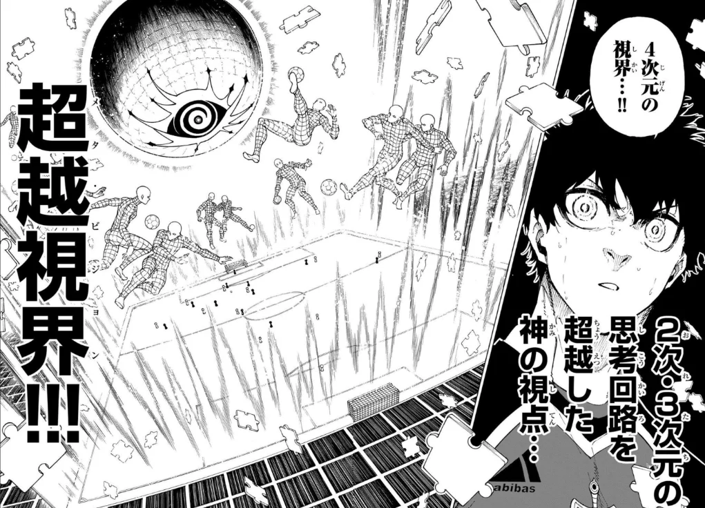 このシーンは主人公の潔世一が世界の有名選手と渡り合うには今のままではいけないと考え、目の前のことではなく試合全体を視ることを習得したシーンです。